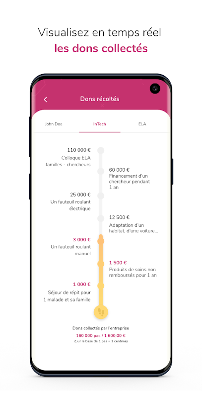 Anda boleh menggunakannya untuk menyertai aktiviti pengumpulan dana badan amal. Ia membolehkan anda mengira langkah anda dan sentiasa melihat jumlah langkah yang diambil oleh kumpulan anda, yang lebih memotivasikan. Prinsipnya mudah: ambil sebanyak mungkin langkah untuk kanak-kanak ELA yang, malangnya, tidak lagi boleh menggunakan kaki mereka. Ia membolehkan anda berkongsi komitmen anda di media sosial, dan jika anda mahu, untuk menukar langkah anda menjadi derma untuk anak-anak ELA.
