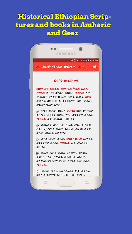 Mezgebe Haymanot adalah aplikasi mudah alih dengan Koleksi Buku Gereja Gereja Ortodoks Titanhedo yang besar. Permohonan mengandungi lebih daripada 200 buku Ortodoks dengan pelbagai kategori. Permohonan ini mengandungi pelbagai buku doa, upacara, psalmodies, pujian, melodi, perkhidmatan, sakramen Gereja Ortodoks Ethiopia. Buku nyanyian Yared, buku liturgi, Buku Aba Giyorgis Zegasicha, Doa Orang Suci dan Malaikat, Commentaries Bible, Buku Kanaan,