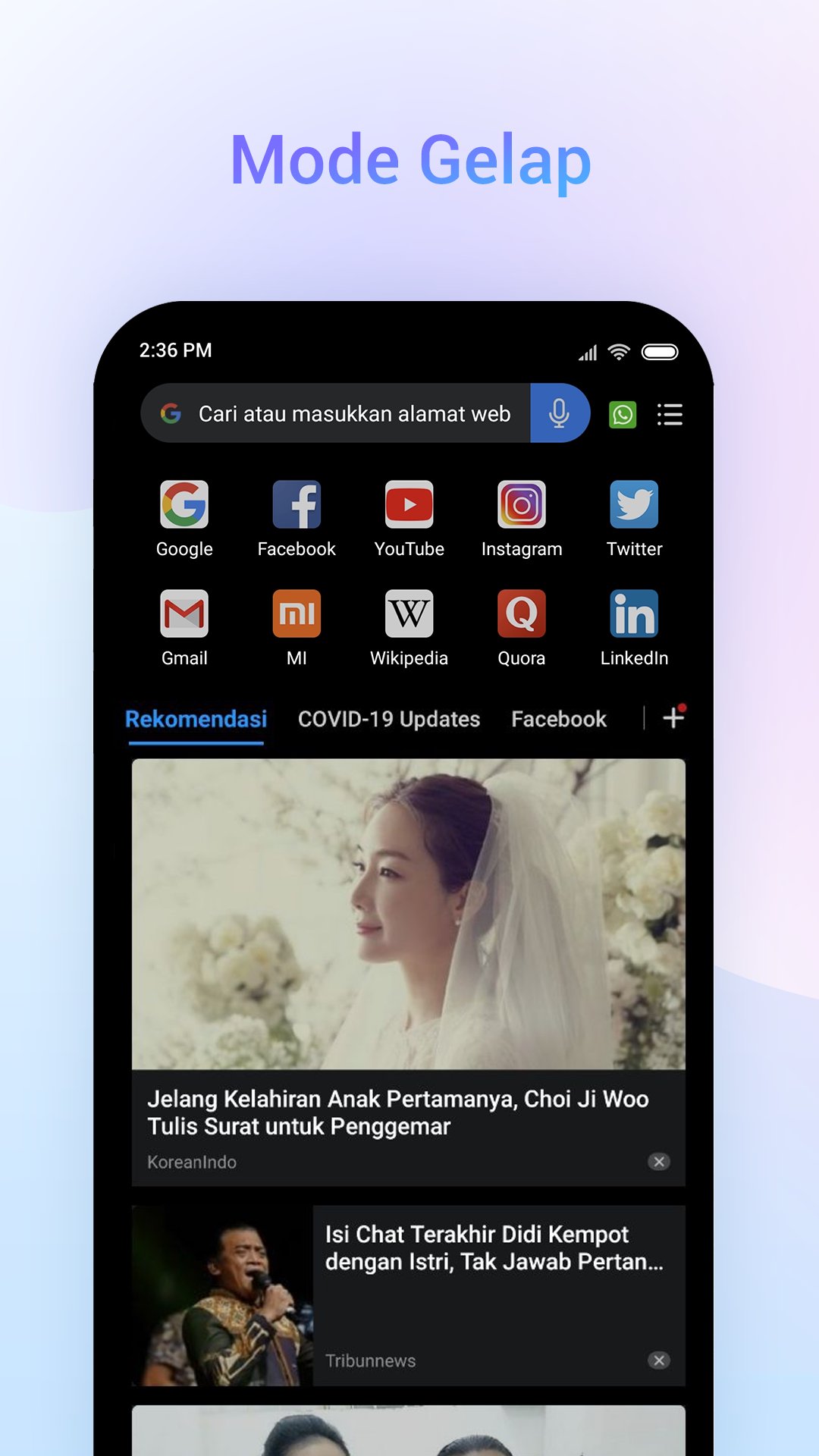 Skema warna gelap Mi Browser menawarkan pengalaman visual baru yang imersif.