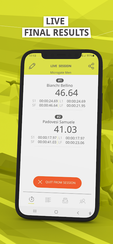 Sebaik sahaja sesi pemasaan bermula, saya boleh berkongsi kod pengenalan sesi dengan Pengguna "Tetamu". Pengguna yang telah memasang apl HiTiming dan menerima mesej teks atau e-mel dengan "ID Sesi" akan melancarkan Apl dalam mod Tetamu dan menerima semua data sesi jauh dalam masa nyata. Setelah sesi ditutup oleh pengguna utama yang disambungkan ke jam randik, sesi pada peranti jauh juga akan ditutup secara automatik. Sesi tertutup akan tersedia dalam Arkib Sesi.