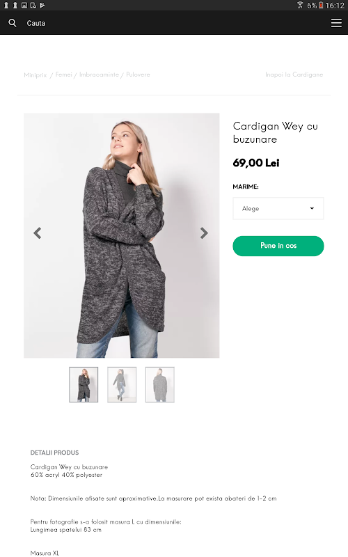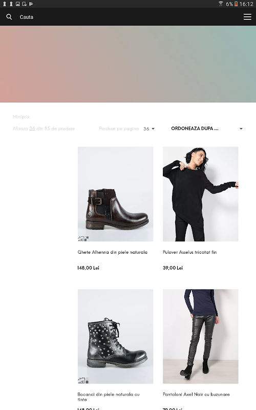 In aplicatia Miniprix, o sa poti accesa magazinul online unde vei gasi colectii noi si promotii pentru femei (incaltaminte de piele naturala, imbracaminte, accesorii), pentru barbati (camasi, pulovere, pantofi), pentru copii (pantaloni, tricouri, geci) dar si alte chestii (decoratiuni interioare, cadouri, jucarii)