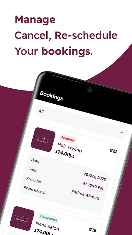 ➢ Mirror: Style Me Up membantu dalam tempahan salun, penjadualan semula, pembatalan dan tempahan semula dengan hujung jari anda.