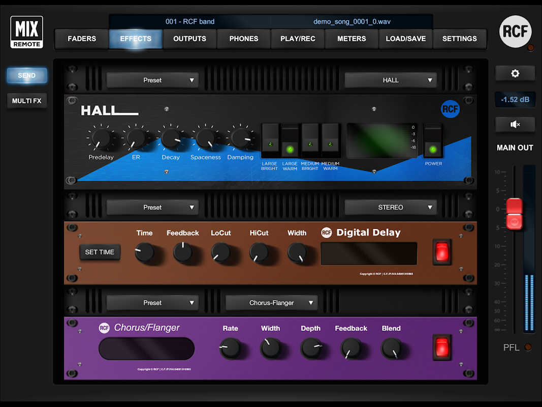Aplikasi ini membolehkan kawalan jauh penuh siri M di RCF audio digital pembancuh.