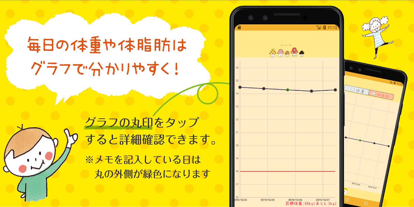 体重、体脂肪率の他に、メモや各マークも確認できます。
