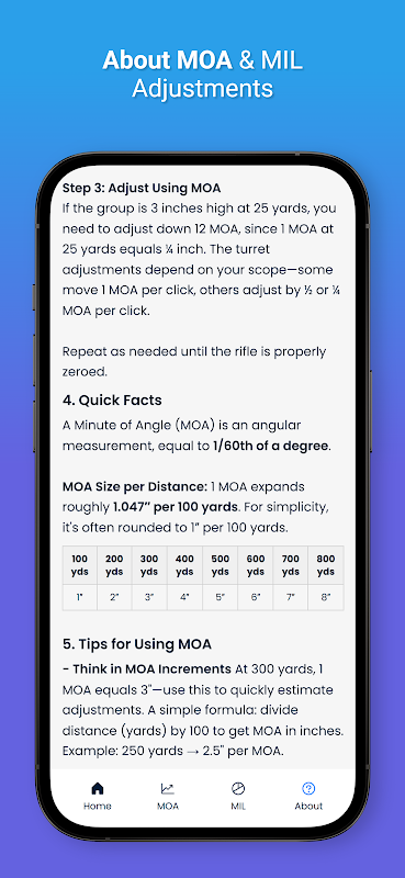 Ambil tekaan daripada pelarasan skop dengan kalkulator MOA & MIL yang mudah digunakan ini. Sama ada anda mendail dalam senapang anda untuk ketepatan jarak jauh atau membuat pelarasan pantas di lapangan, apl ini menyediakan pengiraan tepat untuk kedua-dua pelarasan Minit Sudut (MOA) dan Miliradian (MIL) berdasarkan jarak pilihan anda.