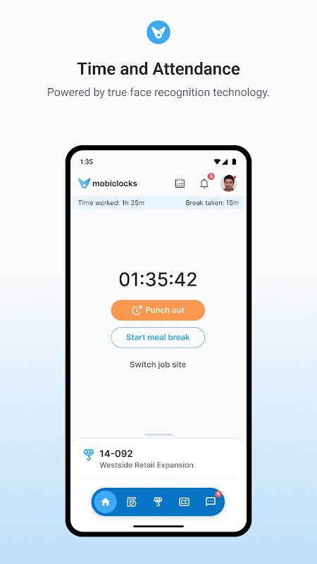 MobiClocks adalah jam waktu mudah alih dengan banyak ciri termasuk GeoFence, True Face Recognition, Cost Coding, Offline punching, GPS mileage tracking dan timestamp dengan keupayaan pekerja untuk melakukan perjalanan antara lokasi pekerjaan jauh dengan mudah tanpa perlu masuk dan keluar di setiap lokasi. Ia juga mengesan jarak tempuh untuk pekerja, seperti pemandu trak, yang dibayar dengan jarak tempuh yang mereka lalui. MobiClocks membolehkan pengguna menyemak kad masa mereka, menandatangani kad masa mereka secara digital dan meminta cuti berbayar (PTO). Ini juga mengenal pasti perakuan yang diterima oleh pekerja dan sub-kontraktor dan ketika perakuan tersebut memerlukan pembaharuan. Aplikasi ini berfungsi pada telefon dan tablet.