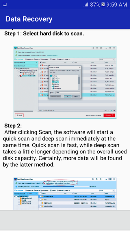 Apl panduan pemulihan data telefon mudah alih 2022 membolehkan anda memulihkan data yang dipadamkan daripada USB, Kad Memori, Mudah Alih, Cakera Keras dan Komputer dengan bantuan Panduan Pemulihan Data. Pulihkan Audio yang dipadam , Pulihkan / Dapatkan semula lagu yang dipadam, Pulihkan Dokumen dari galeri dan dari mana-mana storan lain, Pulihkan Semua Jenis fail (Sokong sambungan berbeza) dengan bantuan panduan pemulihan data.