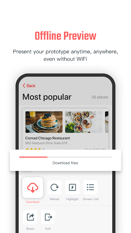 MockingBot Viewer menyokong pratonton prototaip luar talian. Pada mod pratonton, dua jari ketik skrin untuk memilih mod luar talian, dan kemudian anda boleh melihat prototaip anda tanpa sambungan internet.