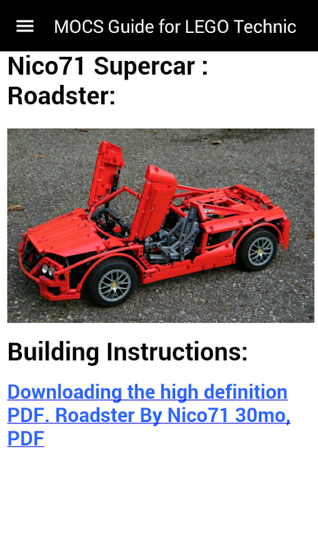 Explore new MOCS for LEGO® Technic top builders and download free instructions all packed in one light application with a simple and easy user interface.