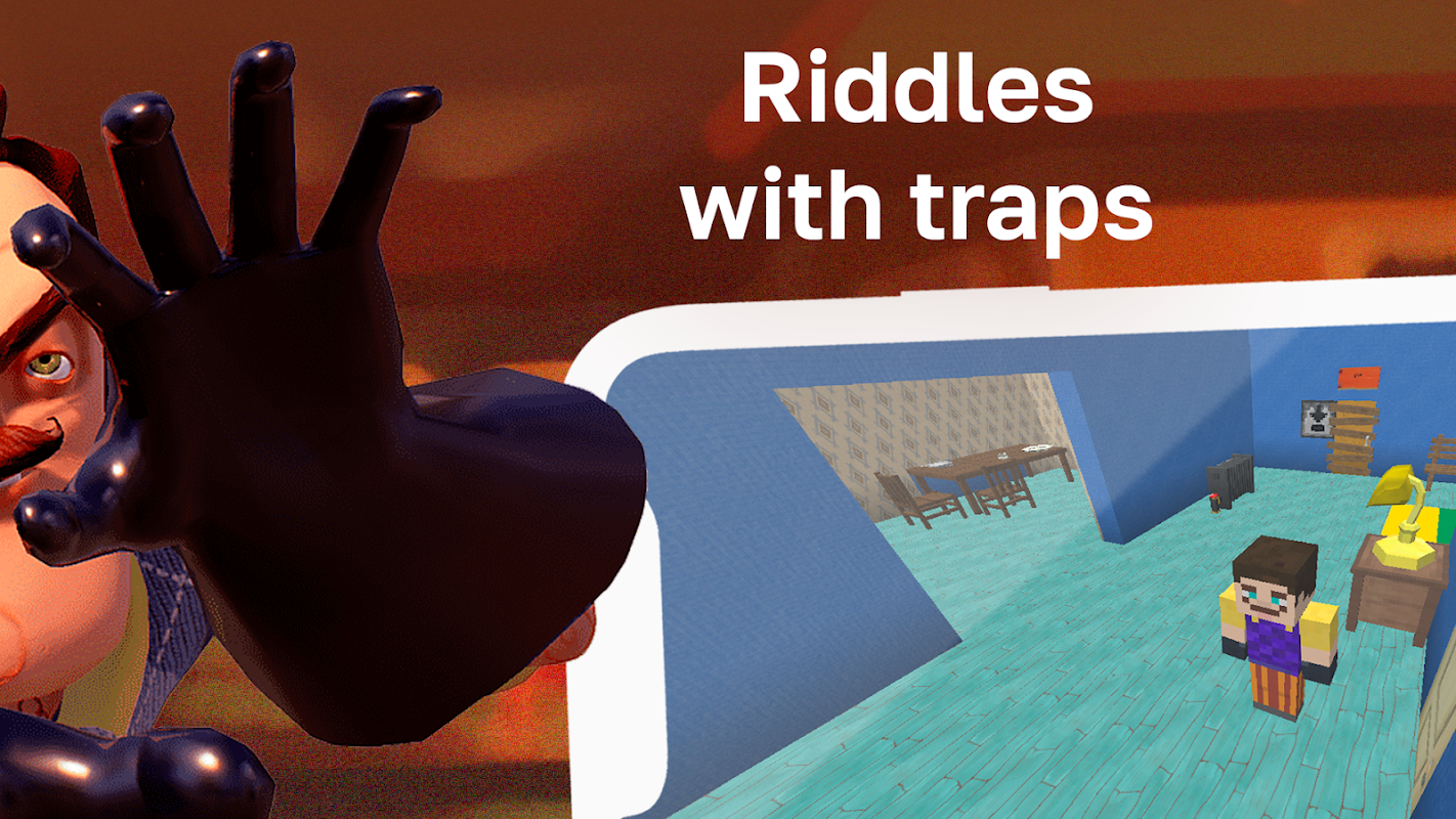 Alpha neighbor mod for Minecraft Pocket Edition is an addon that has a horror map Alpha Hello Neighbor. Here you can find the same house for mcpe Bedrock, which is located in the game of the same name. The evil Alpha neighbor will start chasing you as soon as he sees or hears that you have entered his territory. Therefore, you will need to turn on your logic and dexterity in order to search his house wisely and find what he hides in it and solve all his riddles with traps. The main thing is that you don’t need to say hello, in the mod addition - Neighbor Minecraft Pocket Edition.