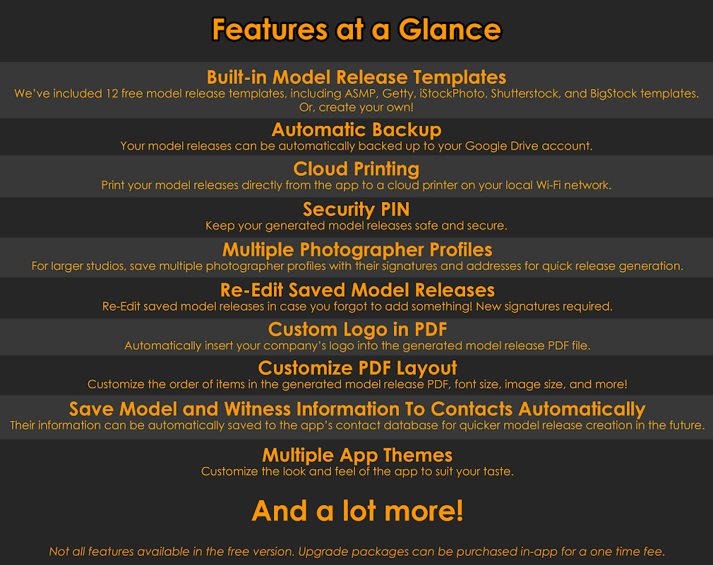 Model pemberi kebebasan adalah aplikasi keluaran model yang paling lengkap dan komprehensif yang membolehkan anda untuk membuat kontrak pembebasan model fotografi di mana sahaja. Model anda boleh mendaftar nama mereka, anda boleh melampirkan foto mereka, dan pelepasan model dalam format PDF akan dihasilkan ... iaitu ia tujuan teras. Tetapi kita juga telah menyertakan banyak alat lain yang berguna dan sumber. Cuba lihat di bawah untuk beberapa ciri-ciri yang anda tidak akan mendapati di mana-mana aplikasi keluaran model lain.