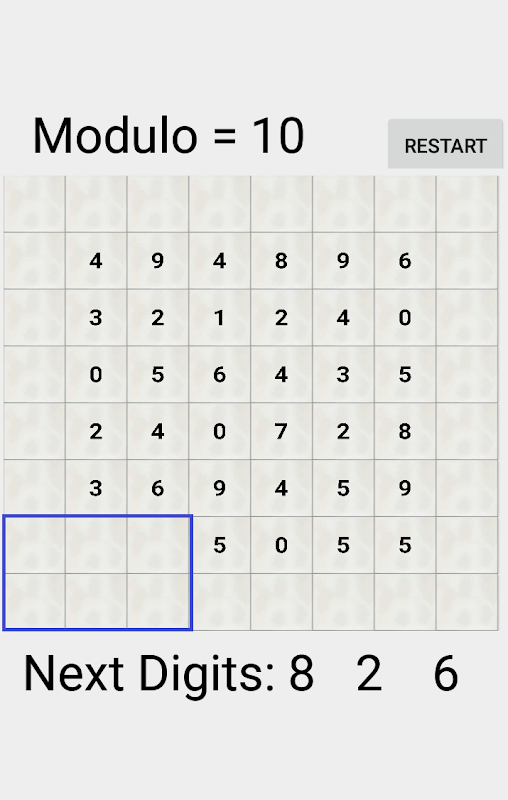 On clicking an empty tile once, the neighboring tiles are highlighted. If the modulus of sum of neighbors is equal to the incoming integer, then upon a second click, the neighboring tiles are cleared. Else, the integer is added at the tile.