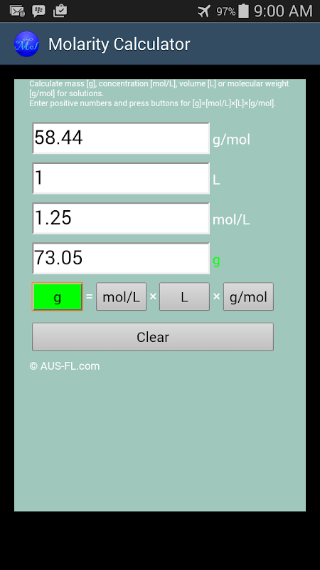 Enter positive numbers and press the buttons for this equation [g] = [mol/L] x [L] x [g/mol] to get the results.