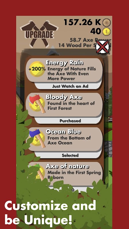 Learn the art of fast tapping or upgrade to a chainsaw to work while you can enjoy forest in the village atmosphere. Remember: EVERY TAP IS IMPORTANT!