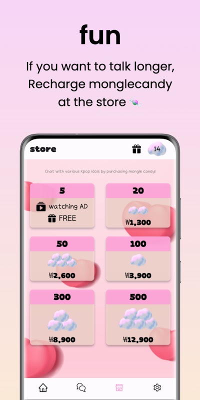 Jangan ragu untuk mengisi ulang permen mongle di Candy Store agar saya dapat berbicara dengan idola favorit saya sebanyak yang saya mau!