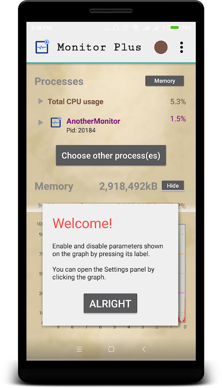 - It shows a chart and several labels wherein the values of the CPU and memory usage are updated every 0.5, 1, 2 or 4 seconds.