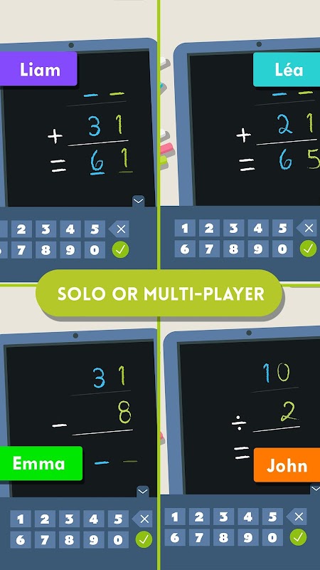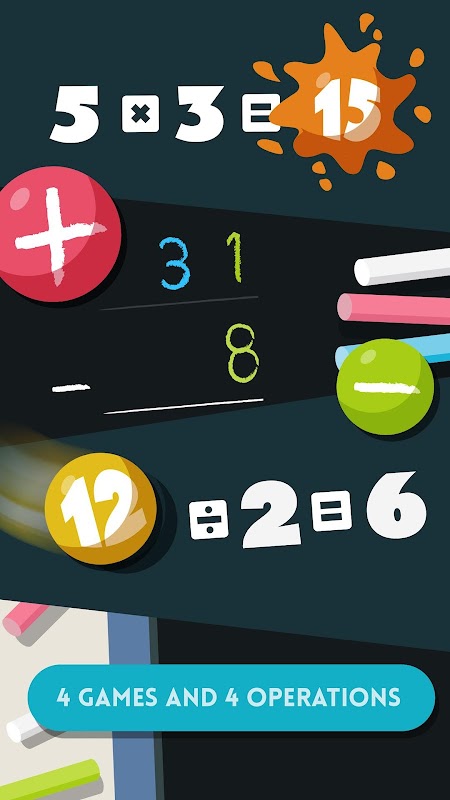 • 4 calculation games: Multiple Choice Questions, Missing Digit, Open Answer and Bubble Game