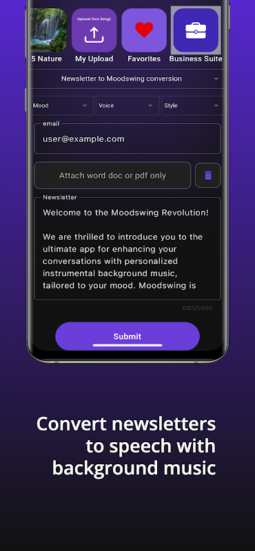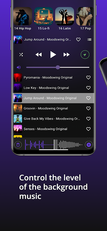 Selamat datang ke Moodswing – aplikasi terbaik untuk meningkatkan perbualan anda dengan muzik latar belakang instrumental yang diperibadikan, disesuaikan dengan mood anda.