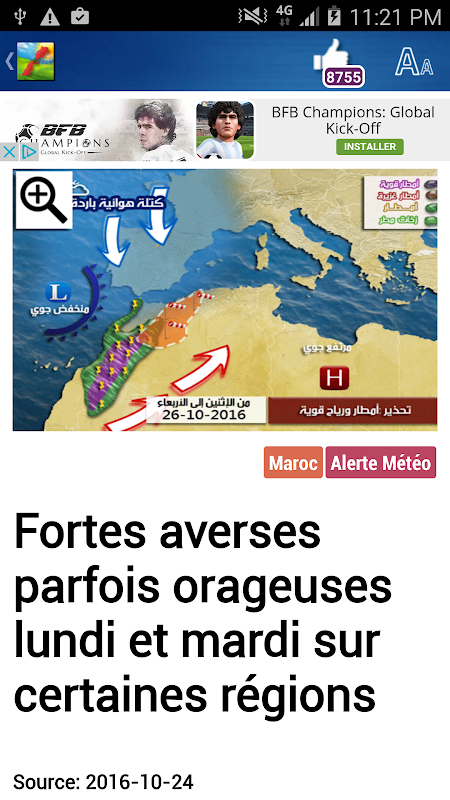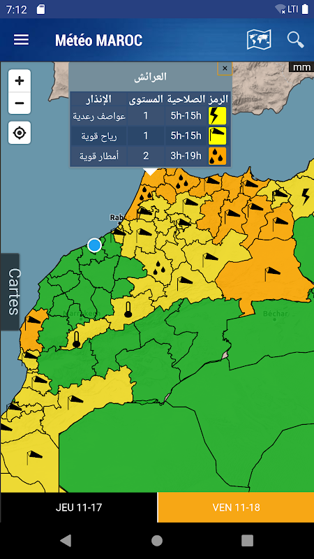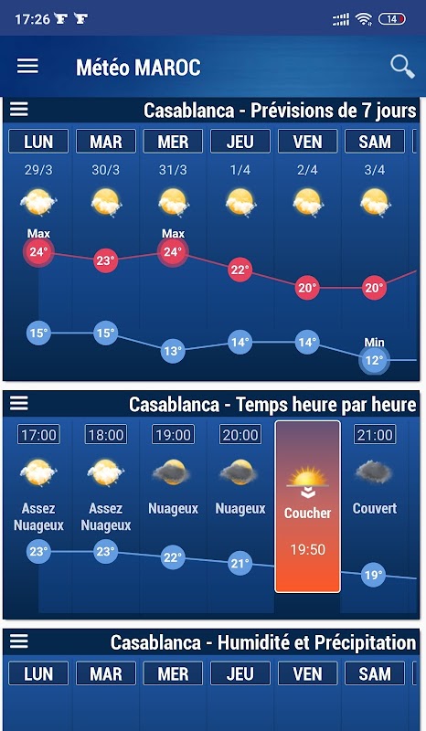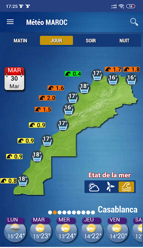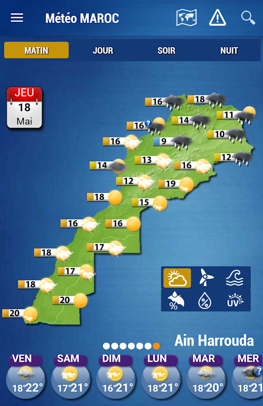 Permohonan disediakan Ramalan Cuaca Maghribi Cuaca (Masa, angin, kelembapan, air pasang, kalendar aktiviti solunar, amaran) kota-kota Maghribi selama lima hari.