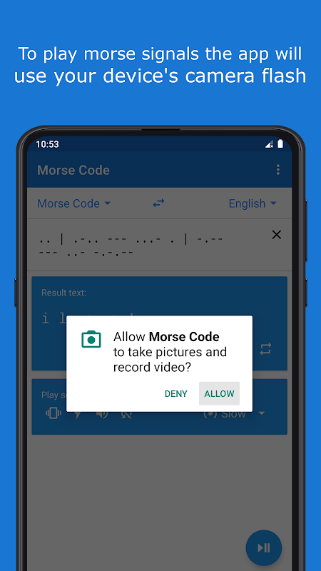 Untuk memainkan isyarat morse apl itu akan menggunakan flash kamera peranti anda.