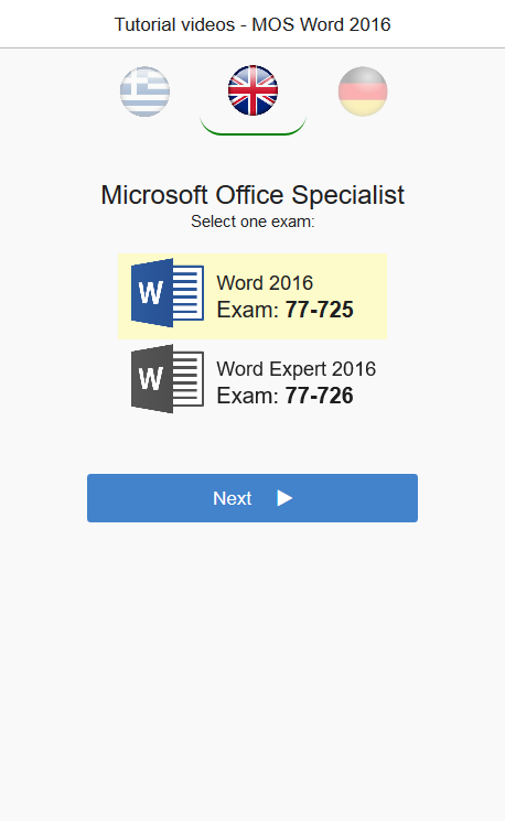 This app provides the users with the opportunity to get an initial picture about the MOS Certiport 77-725 & 77-726 Exams, which lead to the respective Certificate acquisition for MS-Word 2016.