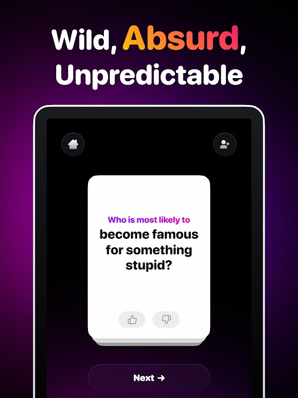 Kemungkinan Besar To ialah permainan parti liar untuk orang dewasa. Ketahui pendapat rakan anda tentang anda dan siapa yang mereka fikir paling berkemungkinan melakukan perkara yang tidak masuk akal. Ia adalah permainan parti yang gila untuk parti rumah, pra-pesta, parti frat dan semua perhimpunan lain.