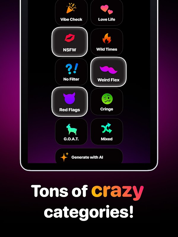 Rasa kotor? Terdapat satu dek kad untuk itu. Ingin mengetahui bagaimana orang lain berfikir tentang perkara kotor? Ia juga ada di sana. Terdapat beberapa perkara perhubungan juga, sesuai untuk pasangan!