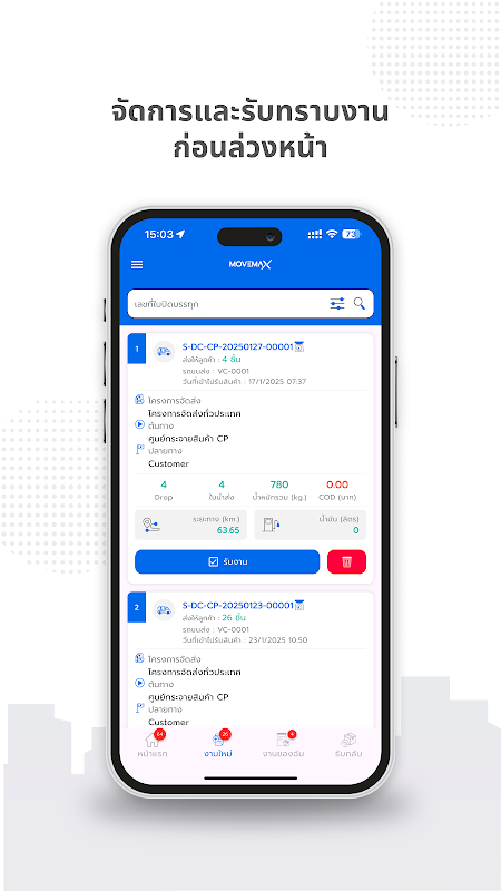Digunakan untuk: Menerima kerja, menghantar kerja yang berkaitan dengan pengangkutan yang dipautkan daripada sistem MoveMax utama.