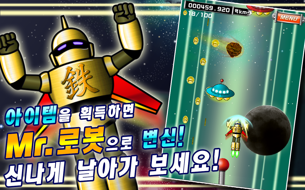 화면을 터치하여 Mr. 로켓을 좌우로 움직이며, 잇달아 나타나는 장애물을 피하면서 우주의 끝까지 날아가면 됩니다!