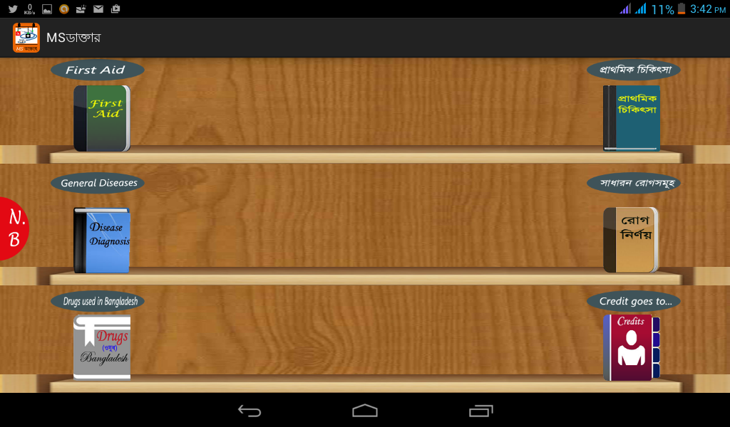 Aplikasi ini penuh dengan maklumat berharga mengenai Aids Pertama, Penyakit dan ubat-ubatan yang dikeluarkan di Bangladesh. Antara muka pengguna Awesome, mudah difahami dan digunakan. Pengguna akan mendapat banyak maklumat berguna dengan dua pilihan bahasa (Bahasa Inggeris dan Bahasa Bengali). Ia adalah dengan bahagian-bahagian berikut.