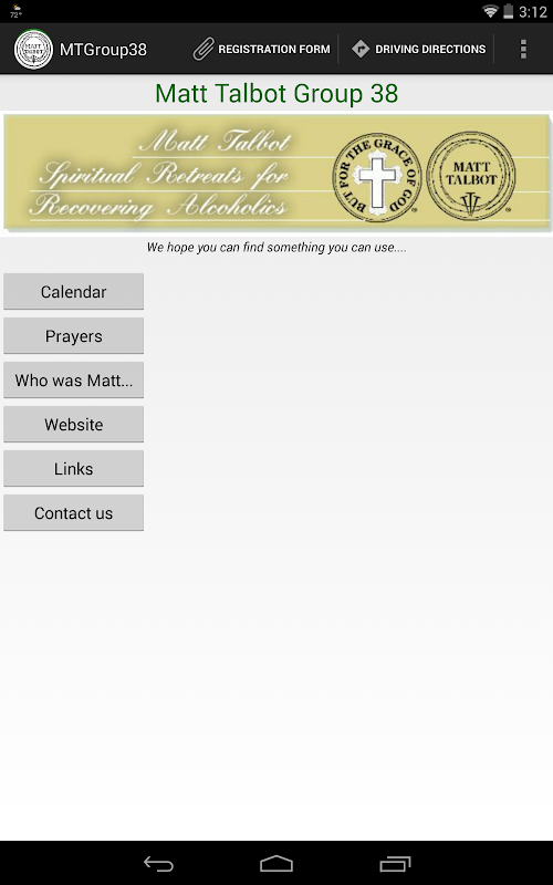 This app provides information resources for Matt Talbot Group 38 members, group affiliates, and anyone else who might be interested in Matt Talbot retreats. Resources include easy access to the Group 38 website, retreat calendar, retreat registration forms, driving directions to the retreat house, and other relevant links. Group members should find this app very useful. Anyone else who might be interested in learning more about Group 38 and its retreats are welcome to use it and reach out to Group 38.