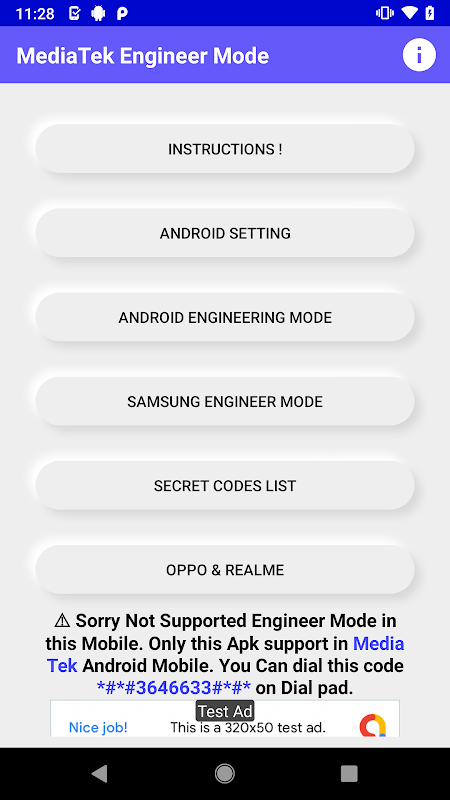 Ia sangat mudah digunakan dan mengaksesnya sangat cepat. dan dapatkan Mod Jurutera yang sangat mudah dengan aplikasi ini pada peranti anda yang disokong MTK (MediaTek). anda boleh mengakses Mod kejuruteraan dengan mudah melalui dail * # * # 3646633 # * # * di pad dail atau cari dari google.com untuk contoh ("kod rahsia mod jurutera telefon bimbit android"). Aplikasi ini belum mengakses maklumat di telefon bimbit anda.