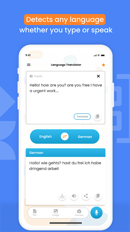 Semua Penterjemah Bahasa menyokong terjemahan teks, terjemahan kamera, terjemahan suara, terjemahan PDF, terjemahan imej dan banyak lagi.