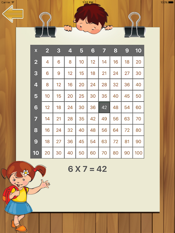 يهدف التطبيق الى تعليم الاطفال جداول الضرب من ٢ الى ١٠ ويمكنك اختبار الطفل في كل جدول منفصل أو اختباره في جميع الجدوال