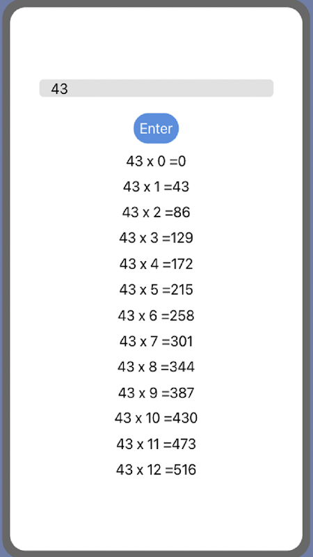 Apabila mengklik butang "Teruskan", anda perlu menaip input teks nombor untuk melihat jadual pendaraban nombor tersebut. Setelah mengklik pada butang "Teruskan" apl akan melaksanakan jadual pendaraban.