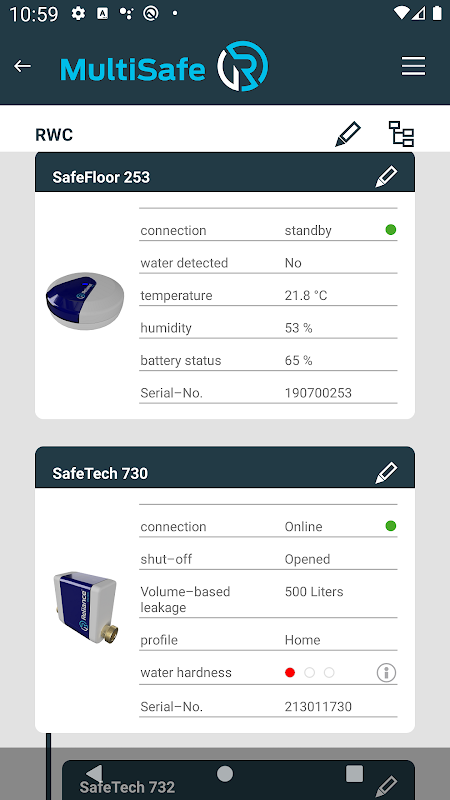 • Pemantauan semua fungsi dapat dilakukan secara on-line menggunakan aplikasi, pengaturan dapat diubah dan injap dibuka dan ditutup. Sensor Kebocoran Lantai Multisafe digunakan di tempat kritikal yang memerlukan pemantauan intensif. Sekiranya sensor pintar ini mengesan air di lantai, suhu bilik yang terlalu rendah atau tahap kelembapan berlebihan, LED akan berkelip dan isyarat amaran kuat akan diberikan. Sekiranya sensor lantai dihubungkan melalui Wi-Fi, maka amaran juga akan dikirim melalui e-mel, atau melalui pesanan teks. Sensor Kebocoran Lantai juga dapat disambungkan ke Pengesan Kebocoran Sistem dan jika kebocoran air dikesan, isyarat juga akan dihantar kepadanya untuk mematikan air. Semua fungsi Sensor Kebocoran Lantai Multisafe dapat dilihat dan disesuaikan dalam aplikasi RWC.