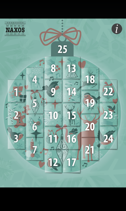 Naxos’s new musical app for Advent features 25 complete tracks behind numbered doors. Each day, a new door is ‘unlocked’ to reveal a new piece of seasonal music from Naxos’s classical music catalogue.