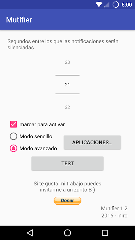 Mutifier membisu pemberitahuan yang berlaku dalam ruang yang singkat. Menetapkan selang saat antara pemberitahuan akan disenyapkan. Sebagai contoh, jika mereka mengikuti banyak mesej, hanya yang pertama akan berbunyi. Pemberitahuan tidak hilang, hanya disenyapkan. tidak Mutifier membaca mana-mana pemberitahuan, hanya anda perlu tahu masa yang apabila ia berlaku.