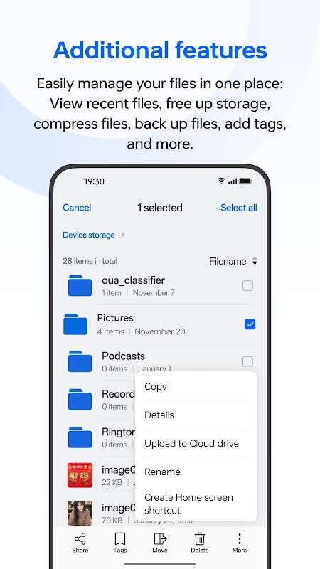 Urus fail anda dengan mudah di satu tempat: Lihat fail terbaharu, kosongkan storan, mampatkan fail, sandarkan fail, tambah teg dan banyak lagi.