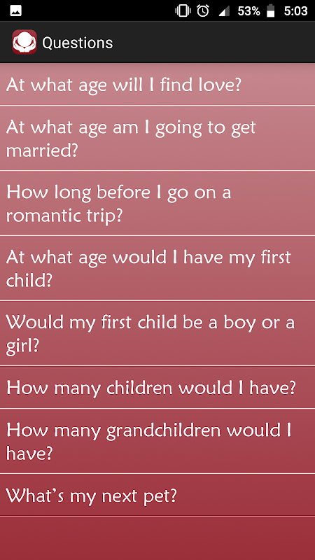 Cukup lancarkan aplikasi, tetapkan nama depan dan belakang anda dan tarikh lahir anda dan kemudian anda boleh mengakses semua jawapan untuk soalan yang anda ada mengenai masa depan anda.