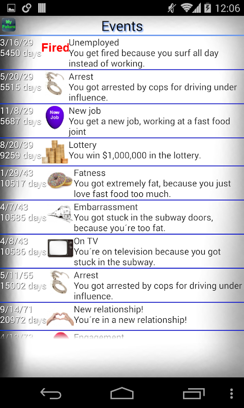This app will tell you, what the rest of your life could look like in every single regard. Whether you get married, or die alone, you will get children or just a pet, win the lottery or climb the mount everest. Go ask "My Future" what might happen to you!