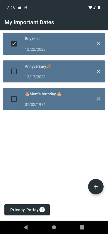 Aplikasi ini akan membantu Anda mengingat tanggal-tanggal penting Anda. Ingat tanggal-tanggal seperti hari jadi, ulang tahun, pernikahan, kencan pertama, dll.