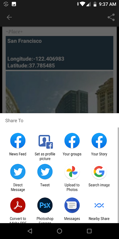 8. Saham Tempat: Kongsi tempat peta kad ke Facebook dinding, Twitter, e-mel dan album foto. Anda juga boleh mendaftar masuk apabila bahagian tempat untuk facebook.