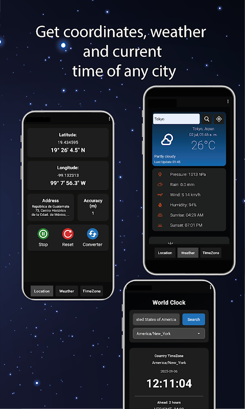 Dapatkan koordinat GPS, cuaca terperinci dan masa di mana-mana sahaja di dunia.