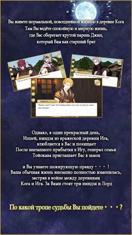 Ваша обычная жизнь внезапно полностью изменилась, застряв в войне между деревнями Кога и Ига. За Вами стоят три ниндзя и Лорд