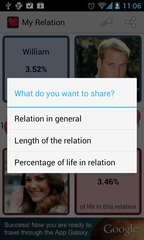This app shows you in a convenient user interface how long you and your partner have been together. The amount of time together is shown in years, months, weeks and days. Next to this the time together as a percentage of your life is shown!