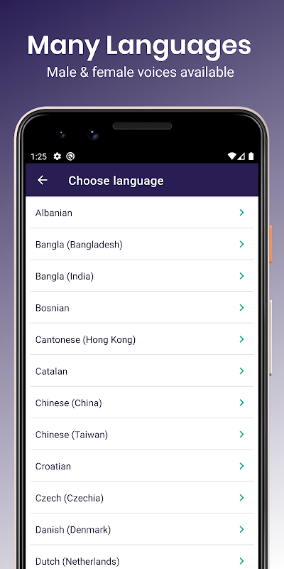 *Perhatikan bahawa senarai bahasa yang tersedia pada peranti anda akan bergantung pada enjin Text To Speech (TTS) lalai anda. Untuk hasil terbaik, kami mengesyorkan menggunakan enjin Google Text To Speech (TTS) sebagai lalai, yang boleh anda ubah dalam tetapan peranti anda. Jika anda menggunakan enjin Text To Speech (TTS) alternatif, seperti Samsung, My Voice masih akan berfungsi, tetapi senarai bahasa anda yang disokong akan berbeza dan tidak begitu luas.