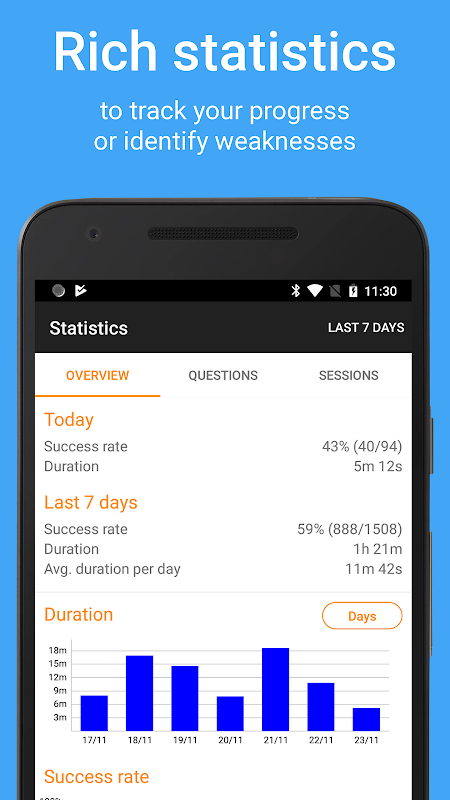 Aplikasi ini menyediakan statistik yang dikemas kini untuk mengesan kemajuan anda dan dapat diselaraskan dengan mudah ke peranti lain. Gunakan laporan statistik untuk melihat kelebihan atau kekurangan anda.