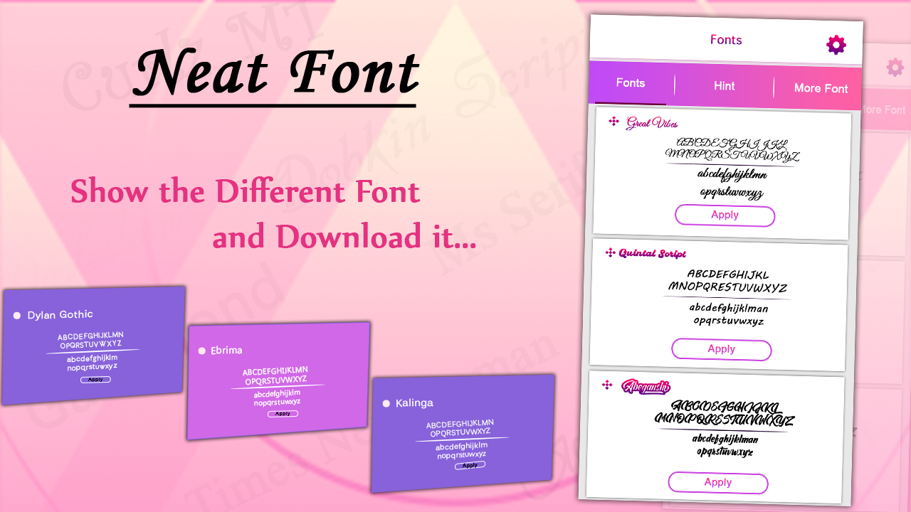 Use our smart Neat Font Free Style application which is allows users to get one or more Font Style in your mobile for free. Application which allows users to see instant preview about fonts and then apply on device. Quick settings to change your font directly fast within some seconds. Get Neat Fonts with Large collection and best way to change the stylish look to Android Phone with attractive Fonts.