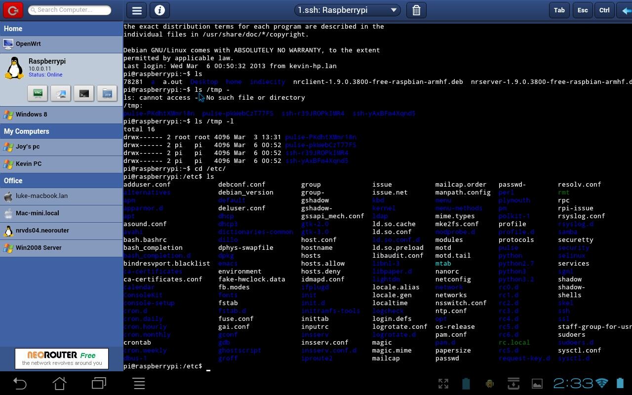 NeoRouter adalah cross-platform sifar konfigurasi penyelesaian VPN yang selamat menghubungkan Windows, Mac, Linux, Android dan FreeBSD komputer di mana-mana lokasi ke LAN maya. Pengguna boleh melihat status komputer ini dan mengaksesnya menggunakan pelbagai alat tambah seperti desktop jauh, terminal, akses fail, dan lain-lain